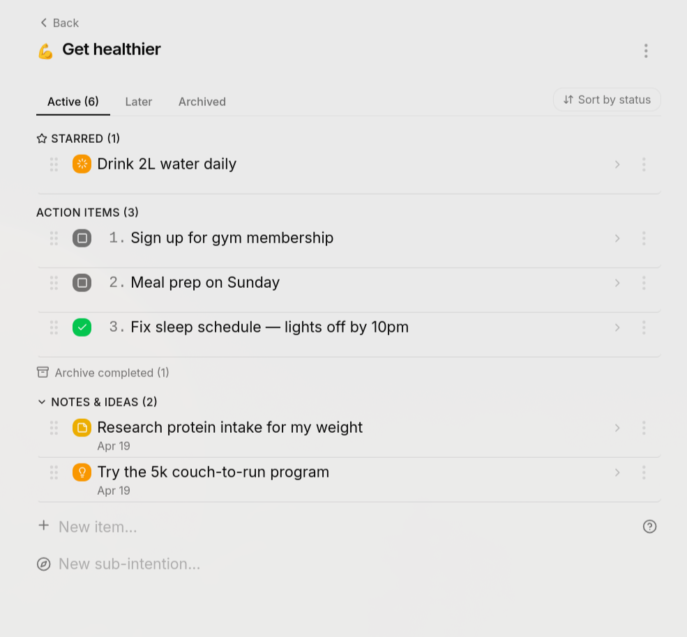 Intentions are different. An intention is simply what matters to you right now. It could be “Get healthier”, “Learn guitar”, “Ship the MVP”, or “Be more present with family”. It doesn’t have to be ambitious or formal. It just has to be real.