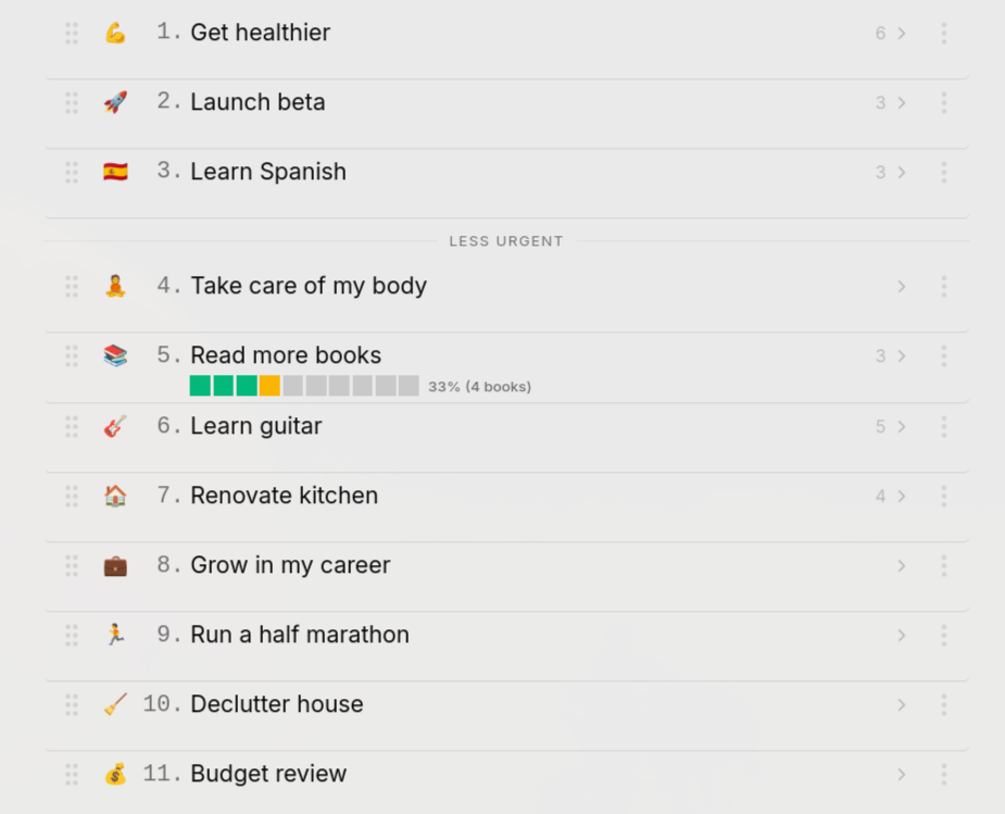Your kid’s school event is next week? Move “Be more present with family” up. After the event, it naturally slides back down.